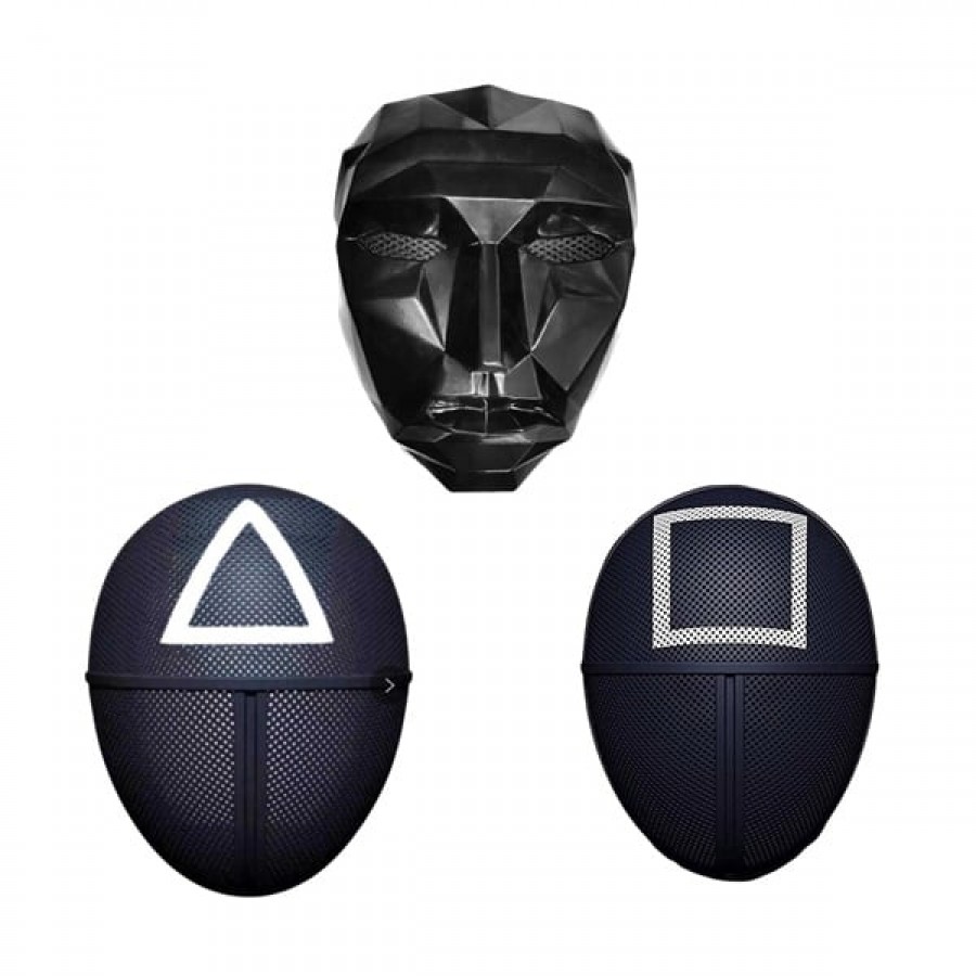 Etichete: Set trei masti pentru carnaval, Squid Game, Triunghi, Patrat, Lider, Negru