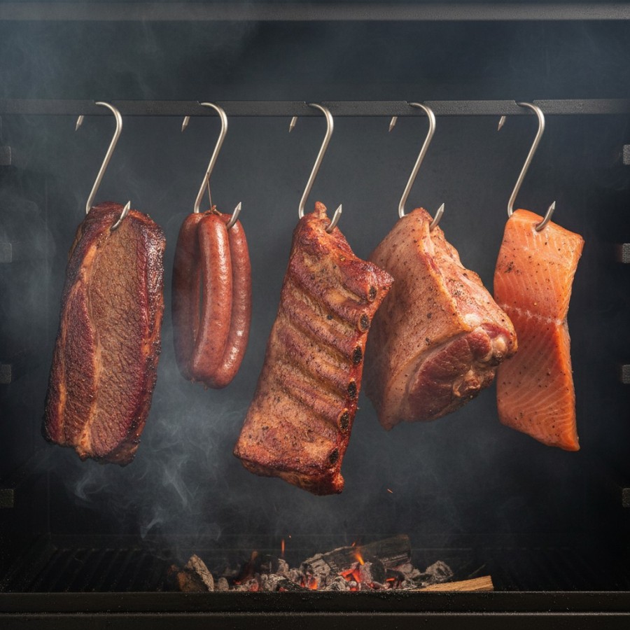 Varfurile ascutite de la ambele capete asigura o fixare sigura a carnii, facilitand manipularea si suspendarea acesteia in timpul proceselor de prelucrare sau afumare.