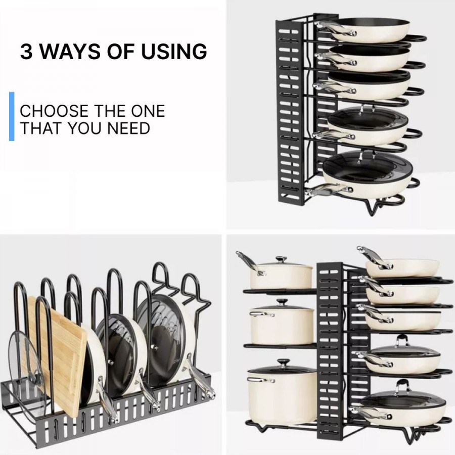 Organizarea si depozitarea bucatariei este excelenta pentru fiecare tigaie, oala din colectia ta de vase, mari sau mici; puteti ajusta cu usurinta nivelurile pentru a gazdui 8 sau mai multe oale (stivuite), tigai, vase de copt, foi, tavi de servire, capace, placi de taiat etc.
