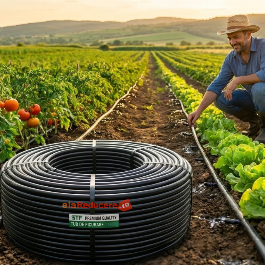 - Tub de picurare cu diametru de 16 mm, rola de 400m, distanta intre picuratori de 25 cm, 4 L/h