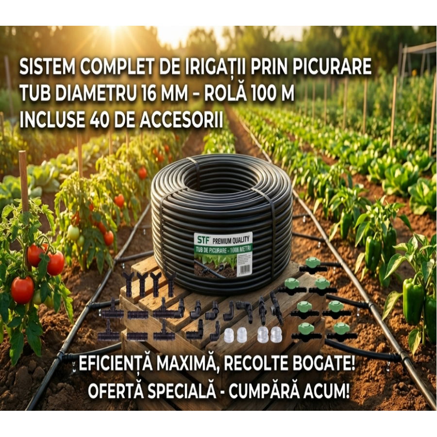 Tub de picurare cu diametru de 16 mm, rola de 100m, distanta intre picuratori de 33 cm, 4 L/h, plus 40 accesorii