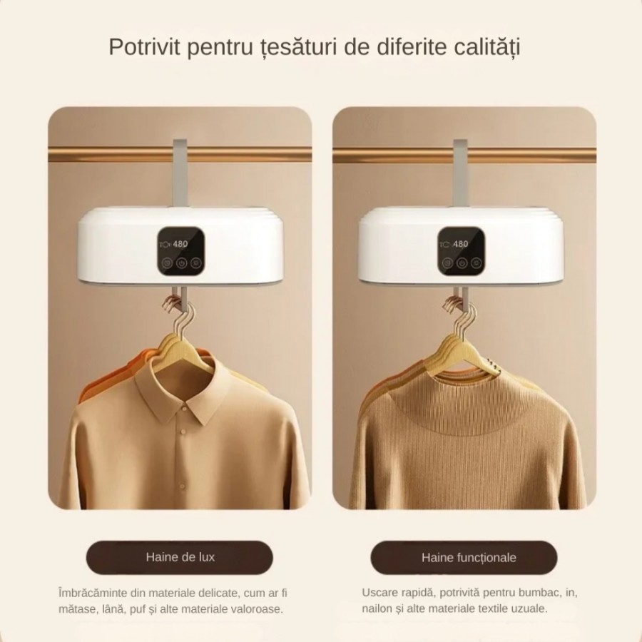 Uscatorul este dotat cu o putere de 600W, asigurand o uscare rapida si uniforma a rufelor. Pe langa uscarea eficienta cu aer cald, functia de sterilizare UV ofera un nivel suplimentar de igiena, fiind ideal pentru imbracamintea copiilor sau pentru persoanele cu sensibilitati. Poti seta temperatura constanta ideala, protejand astfel hainele impotriva deteriorarii.